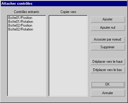 La liste Contrôles entrants située à gauche affiche toutes les pistes entrantes. La liste Copier vers située à droite contient toutes les pistes de la scène courante auxquelles vous attachez un contrôle.