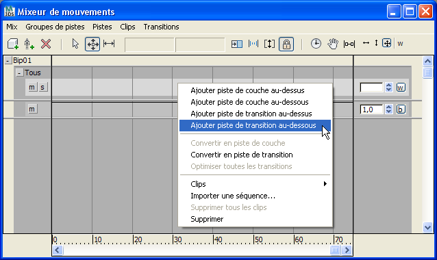 Dans le mixeur de mouvements, le processus de mixage consiste d'abord à ouvrir le mixeur, puis à ajouter des objets à mixer, et enfin à charger des clips de séquence sur des pistes de clips. Une piste de clip est automatiquement créée lorsque vous ouvrez le mixeur après avoir sélectionné un bipède, mais vous aurez probablement besoin d'en créer d'autres pour contenir tous les mouvements à utiliser avec vos objets mixés.