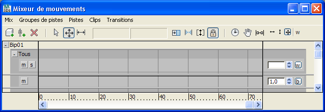 Lorsque vous ouvrez le mixeur, un groupe de pistes, une piste de clip et une piste d'équilibrage sont affectés au bipède sélectionné, le cas échéant. Si l'objet sélectionné est un objet non bipède, le mixeur est vide.
