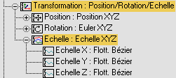Le contrôleur Echelle XYZ dispose de contrôleurs flottants indépendants pour chaque axe de transformation d'un objet. Le fait d'avoir trois pistes distinctes pour l'échelle vous permet de créer des clés d'échelle indépendantes pour chaque axe, de modifier les paramètres d'interpolation d'un seul axe ou d'affecter un contrôleur à un axe. Après avoir appliqué le contrôleur Echelle XYZ, vous pouvez, par exemple, appliquer un contrôleur de bruit ou d'ondes à un axe afin d'animer cet axe indépendamment.