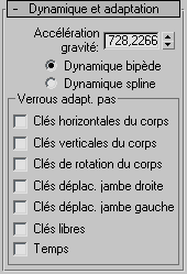 Les commandes du panneau déroulant Dynamique et adaptation permettent de spécifier le mode de création de l'animation de bipède. Grâce à ces commandes, vous pouvez modifier l'intensité de la gravité, définir les propriétés dynamiques des clés générées par les pas précédemment créés, déterminer le nombre de pistes de transformation disponibles sur le bipède et désactiver l'adaptation des clés.