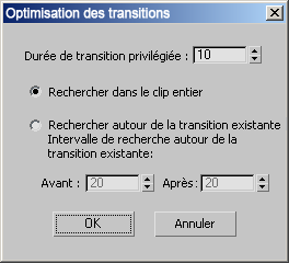Les options dans la boîte de dialogue Optimisation des transitions vous permettent de sélectionner la plage sur laquelle l'algorithme d'optimisation recherchera la transition. Il peut effectuer la recherche dans l'intégralité du clip ou près de la transition existante. Vous devez spécifier la longueur souhaitée pour la transition optimisée. Character studio essaiera de se rapprocher au plus près de cette valeur, en sélectionnant la longueur la plus appropriée.