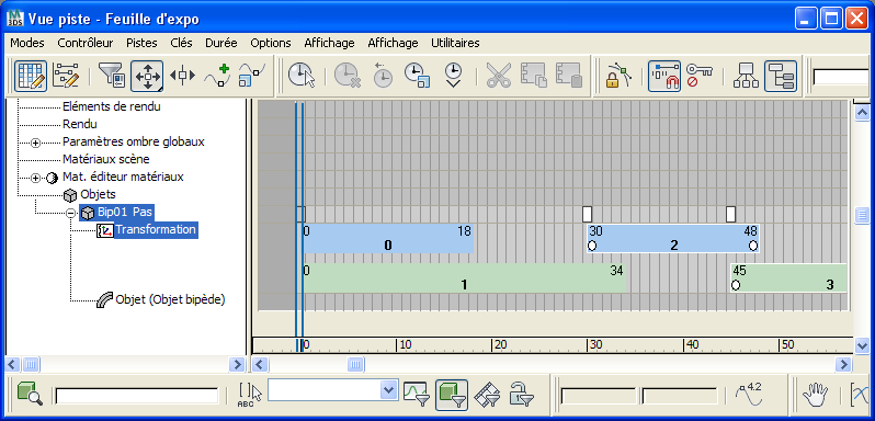 Dans le cadre d'une animation en mode Pas, il existe quatre états des pieds : déplacement, réception, station et élévation. Ces états correspondent aux différentes positions que peuvent avoir les pieds du bipède dans une séquence de pas. Utilisez l'état du pied affiché dans le panneau déroulant Bipède pour déterminer l'état des pieds du bipède lorsque vous modifiez les clés des jambes ou des pieds. Vous pouvez afficher l'état des pieds dans la fenêtre en activant Etats jambes dans la zone Affichage du panneau déroulant Bipède développé. L'état des pieds est représenté par des clés de différentes couleurs dans le mode Feuille d'expo de la vue piste.