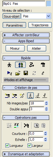 L'avantage du mode Pas est qu'il permet d'adapter naturellement la position du bipède lorsque vous modifiez les pas dans le temps et l'espace. La modification des pas dans les fenêtres permet de repositionner l'ensemble des pas pour déplacer l'animation dans sa totalité. En mode Pas, la longueur, la largeur et la direction de l'enjambée peuvent être modifiées rapidement pour l'intégralité d'une animation, le bipède s'adaptant alors automatiquement.