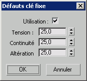 - Contrôle les propriétés tangentielles de la courbe au niveau de la clé. Le paramètre par défaut est la seule valeur qui engendre une courbe d'animation lisse aux environs de la clé. Toutes les autres valeurs engendrent une discontinuité de la courbe d'animation, créant de ce fait un changement brusque dans l'animation. Valeur par défaut=25.