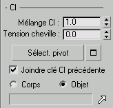 - Définit une clé de bipède sur une valeur de mélange CI égale à 1, avec l'option Joindre clé CI précédente active et l'option Objet sélectionnée dans la zone CI.