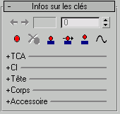 Certaines zones du panneau déroulant Infos sur les clés sont grisées selon la partie du bipède sélectionnée et si la clé est courante ou non. Verticale corps, Horizontale corps et Rotation du corps sont les trois pistes utilisées pour animer le centre de gravité du bipède. Sélectionnez-en une à partir du panneau déroulant Sélection de piste, puis cliquez sur Clé suivante ou Clé précédente pour passer à la clé que vous voulez modifier.