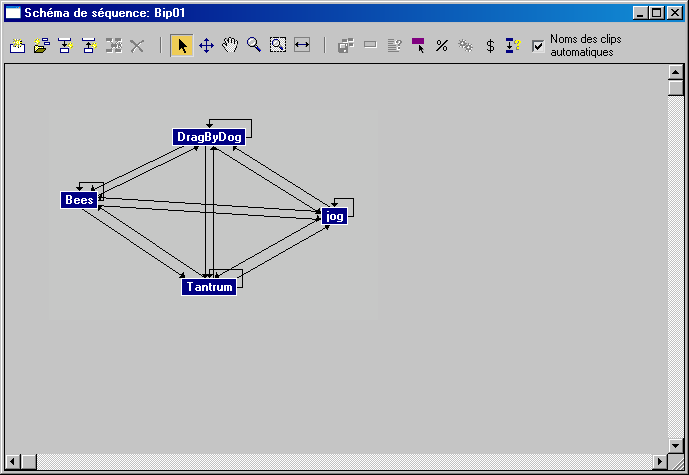 Les commandes de la boîte de dialogue Créer mouvement aléatoire vous permettent de créer un mouvement qui parcourt de manière aléatoire les clips figurant dans le schéma de séquence pour animer un ou plusieurs bipèdes. Les paramètres d'un mouvement aléatoire sont à définir dans le schéma de séquence, dans les boîtes de dialogue des clips et des transitions, ainsi que dans la boîte de dialogue Créer mouvement aléatoire.