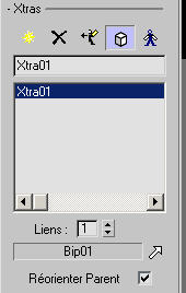 La zone Xtras vous permet d'ajouter des queues supplémentaires au bipède. Les queues supplémentaires sont comme des queues de cheval: elles n'utilisent pas de cinématique inverse et vous devez les animer avec une cinématique avant telle que des clés de rotation. D'autre part, les queues supplémentaires ne doivent pas forcément être attachées à la tête.