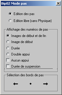 L'édition libre suspend la dynamique physique qui contrôle normalement l'animation du bipède. C'est essentiel lorsque vous souhaitez faire voler, s'asseoir ou tomber le bipède. Notez que la période libre doit être spécifiée entre des pas.