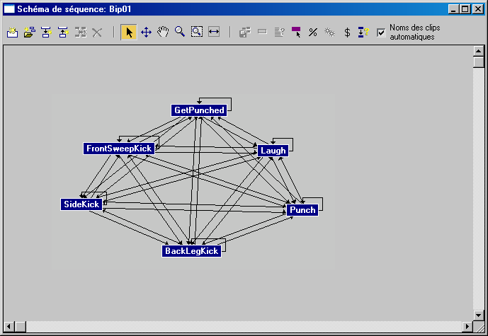 Toutes les transitions qui lient des clips ont un poids de 100, ce qui signifie qu'elles ont toutes la même chance d'être utilisées de manière aléatoire.