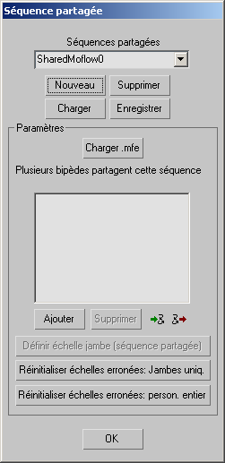 La boîte de dialogue Séquence partagée permet d'affecter une seule séquence à plusieurs bipèdes ou à plusieurs foules. Plutôt que de créer un réseau de séquences pour chaque bipède, vous pouvez créer une seule séquence avec tous les clips et toutes les transitions pour animer plusieurs bipèdes. La séquence de chaque bipède sera utilisée pour créer le mouvement aléatoire. Si la séquence d'un bipède est une séquence partagée, elle sera utilisée pour calculer le mouvement aléatoire.
