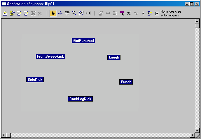 Un bipède partageant une séquence partage uniquement les clips que vous avez ajoutés au schéma de séquence. Chaque bipède possède son propre script, bien que celui-ci fasse référence aux scripts de la séquence partagée. La séquence et les scripts des bipèdes utilisant une séquence partagée peuvent être modifiés à l'aide des méthodes habituelles. Vous pouvez créer un mouvement aléatoire pour un bipède utilisant une séquence partagée ou créer un script de séquence à l'aide du système Crowd.
