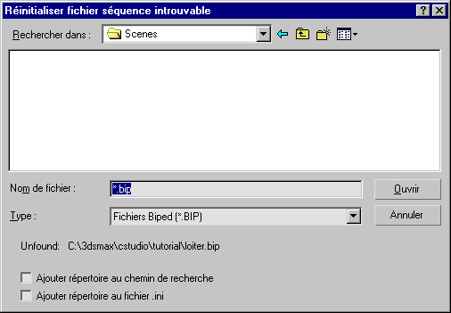 Remarque : Une fois le fichier .bip trouvé, vous pouvez activer l'option Ajouter répertoire au fichier .INI. Le répertoire est alors automatiquement ajouté à votre fichier biped.ini. Puisque le fichier biped.ini accepte plusieurs chemins de recherche, le nouveau répertoire est ajouté sous la forme d'une autre ligne