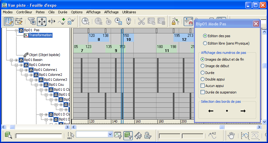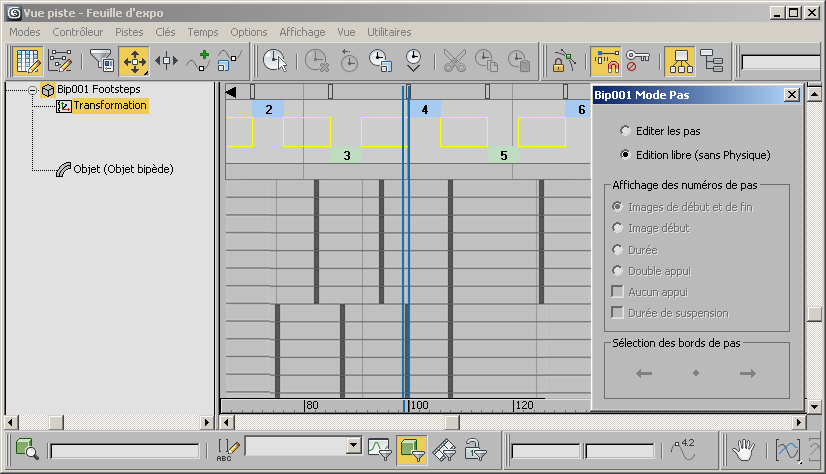 Par exemple, si vous voulez faire courir le bipède, le faire plonger dans une piscine, puis grimper hors de celle-ci, vous créerez des pas pour les parties de l'animation où il court et grimpe, mais pas pour la partie où il nage. Lorsque vous activerez les pas, le bipède sera en suspension pendant la période où il saute et nage, entre les pas correspondant aux périodes de course et d'ascension.