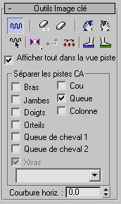 Utilisez les commandes du panneau déroulant Outils Image clé pour supprimer l'animation du bipède ou d'une partie sélectionnée, recréer symétriquement une animation de bipède et faire pivoter le cou dans l'espace du corps plutôt que dans l'espace parent. Ce groupe de fonctions vous permet également de courber la piste horizontale du centre de gravité autour d'une clé horizontale sélectionnée.
