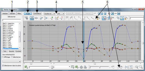 Bien entendu, vous pouvez également afficher et manipuler les courbes de fonction des bipèdes dans la vue piste et la barre des pistes étendue de 3ds Max. Cependant, les outils d'analyse automatique des erreurs sont uniquement disponibles dans l'atelier.