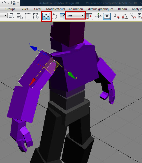 Par défaut, CAT utilise l'axe X comme axe de longueur pour tous les os. Cela signifie que si vous sélectionnez un os et que vous activez le mode de transformation Déplacement, puis que vous définissez le système de coordonnées sur Local, l'axe désigné comme axe des longueurs est aligné sur la longueur de l'os.