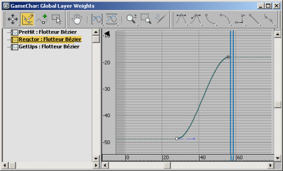 panneau déroulant Gestionnaire de couches, cliquez sur L'Editeur de courbes s'ouvre pour la vue Poids de la Couche globale, affichant les couches existantes de l'ossature. L'illustration ci-dessous montre trois couche : PreHit, Reactor et GetsUp.