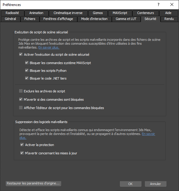 Dans le groupe de fonctions Sécurité de la boîte de dialogue Préférences, définissez les options de la fonctionnalité Exécution de script de scène sécurisé.