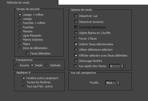Remarque : Les paramètres des groupes Niveau de rendu et Transparence sont également accessibles dans le menu Etiquette Ombrage de fenêtre.