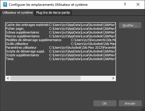 Toutes les modifications apportées aux chemins sont enregistrées dans le fichier 3dsmax.ini.