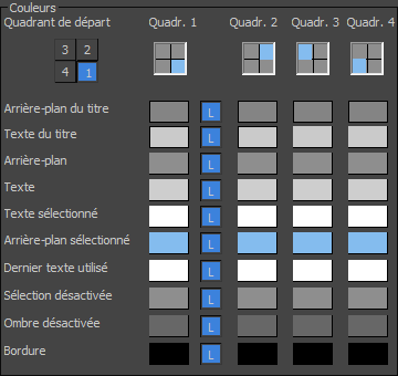 - Répertorie les éléments personnalisables du menu quadr. et les sépare par quadrant. Cliquez sur l'échantillon de couleur pour ouvrir une boîte de dialogue de sélection de couleurs.
