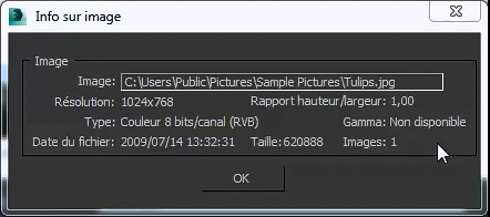 Pour savoir si un fichier inclut une valeur gamma, cliquez sur le bouton Infos de la boîte de dialogue du fichier bitmap.