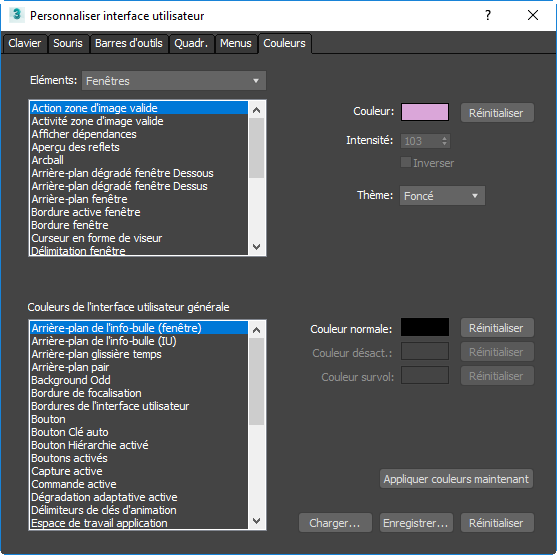 Le groupe de fonctions Couleurs de la boîte de dialogue Personnaliser interface utilisateur vous permet de personnaliser l'aspect de l'interface de 3ds Max. Vous pouvez librement choisir les couleurs de la quasi-totalité des éléments de l'interface et créer ainsi une interface unique.