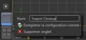 Vous pouvez ajouter une valeur prédéfinie personnalisée basée sur un onglet existant en cliquant avec le bouton droit de la souris sur cet onglet, puis en choisissant Enregistrer la configuration comme valeur prédéfinie. La valeur prédéfinie personnalisée mémorise la présentation (nombre et disposition des fenêtres) et les points de vue des fenêtres. En outre, lorsque le pilote d'affichage Nitrous est activé, elle mémorise également les modes de rendu de la fenêtre. La valeur prédéfinie personnalisée ne conserve pas les transformations de la vue (panoramique/orbite/zoom). Les valeurs prédéfinies personnalisées sont conservées d'une session à l'autre et peuvent être renommées ou supprimées.
