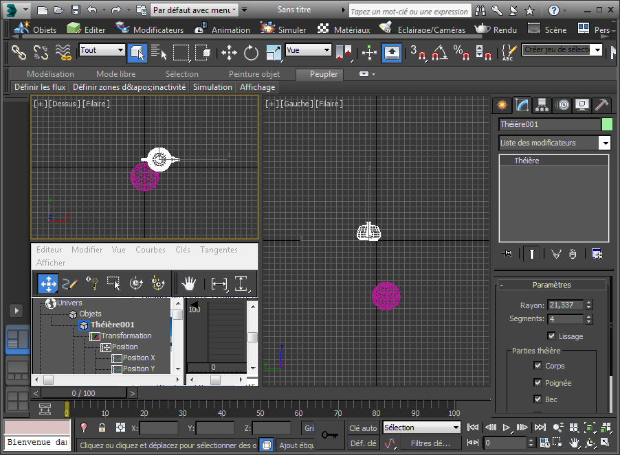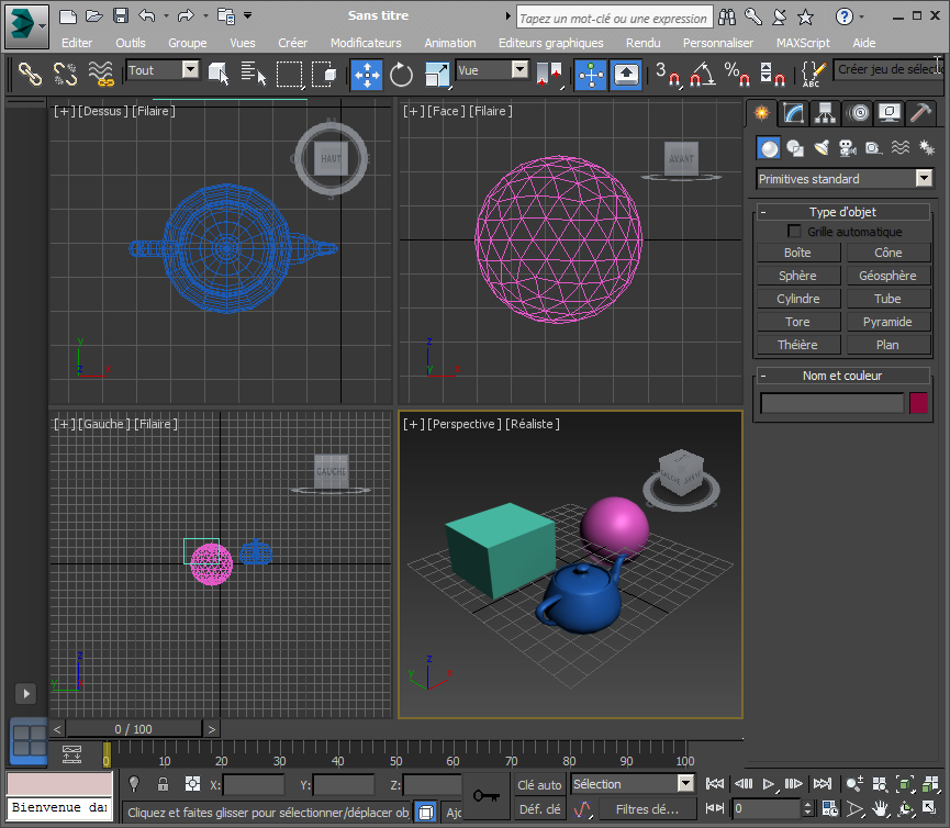 La fonction Présentations de fenêtre permet de faciliter un nombre illimité de méthodes différentes dans 3ds Max. La procédure suivante illustre une méthode qui permet d'activer plusieurs vues d'une scène, ainsi qu'une fenêtre étendue.