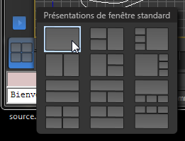 Ouvrez le menu Dispositions en cliquant sur le bouton de direction de la barre d'onglets Présentations de fenêtre. L'info-bulle de ce bouton est "Onglet Créer une présentation de fenêtre". Pour charger une nouvelle présentation et son onglet à partir de n'importe quelle valeur prédéfinie du menu, cliquez sur son icône. Une fois que vous avez chargé une valeur prédéfinie, vous pouvez la personnaliser en modifiant la taille des fenêtres, le point de vue et les options de fenêtre étendue, puis l'enregistrer en tant que nouvelle valeur prédéfinie.