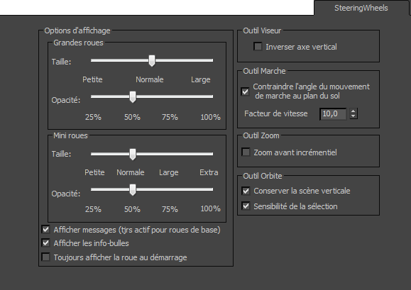 Ces commandes agissent sur l'interaction avec la fonction SteeringWheels. Toute modification apportée aux paramètres est conservée entre les sessions.