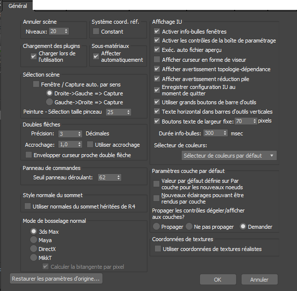 - Mode 3ds Max(par défaut) Choisissez cette option pour garantir la compatibilité avec les maps normales ancrées par l'outil Rendu en texture.