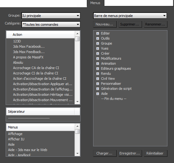 Le groupe de fonctions Menus permet de personnaliser les divers menus de 3ds Max. Vous pouvez éditer les menus existants ou créer vos propres menus. Vous pouvez également personnaliser les libellés des menus, leurs fonctionnalités ainsi que leur présentation.