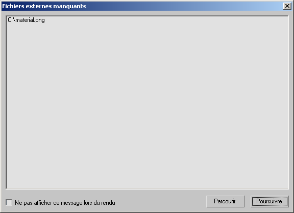 - S'affiche uniquement lors du rendu. Lorsque cette option est activée, 3ds Max n'affichera pas la boîte de dialogue la prochaine fois que des fichiers externes seront introuvables.