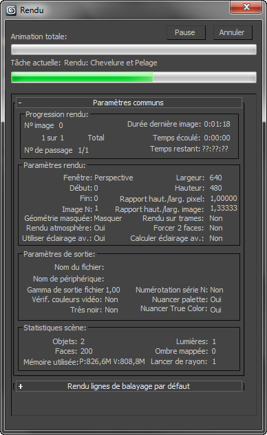 Avec le rendu lignes de balayage, par exemple, il existe un bouton Pause, situé à gauche du bouton Annuler. Lorsque vous cliquez sur ce bouton, le rendu s'interrompt et le titre du bouton devient Reprendre. Cliquez sur Reprendre pour relancer le rendu.