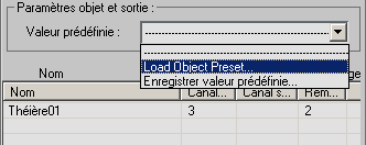 - Objets prép.cette liste affiche tous les objets visibles et dégelés de la scène (qu'ils soient sélectionnés ou pas) auxquels est appliquée une texture développée.