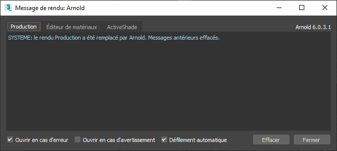 En outre, la zone de message est répartie sur trois onglets (pour plus d'informations sur les différences entre les rendus Production, Editeur de matériaux et ActiveShade) :