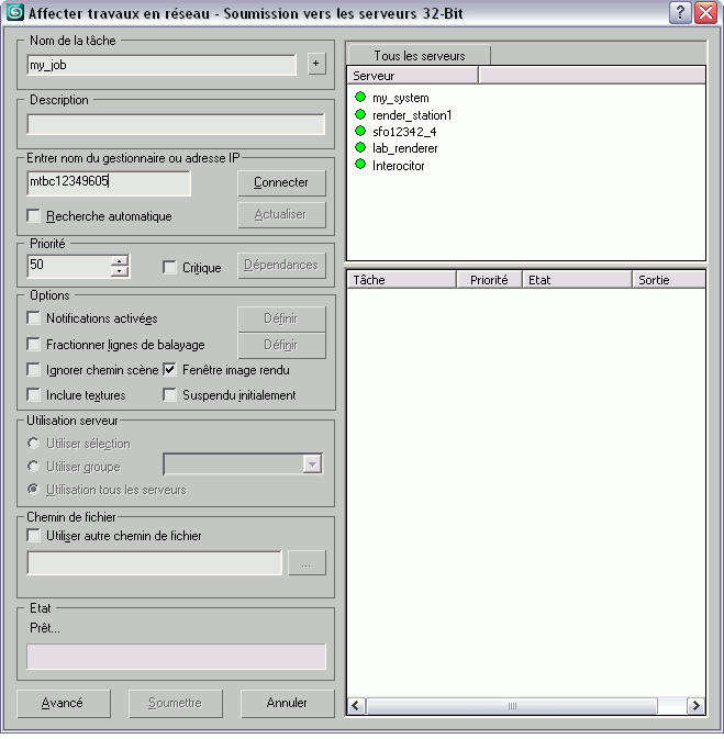 Pour utiliser une exploitation de rendu, vous devez sortir une séquence d'images dans un format de fichier d'image statique, tel qu'une série de fichiers BMP. Vous ne pouvez pas effectuer le rendu de formats de fichier image animé, tels qu'AVI ou MOV sur de multiples systèmes. Le rendu de fichiers animés doit être effectué sur un seul système. Lors du rendu vers un format de fichier image animé, la case à cocher Utiliser tous les serveurs de la boîte de dialogue Affecter travaux en réseau n'est pas disponible.