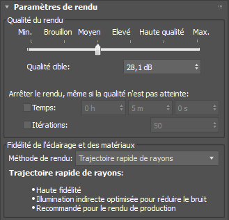 La barre de défilement et le champ Qualité cible contrôlent le niveau de qualité à atteindre pour arrêter le rendu. Plus le niveau de qualité est élevé, plus le temps de rendu est long.