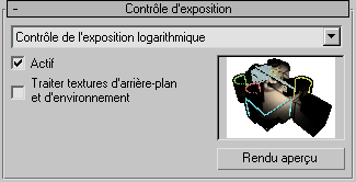 - La miniature affiche un aperçu du rendu de la scène avec le contrôle d'exposition actif appliqué. Une fois qu'un aperçu a été rendu, il est mis à jour de manière interactive lorsque vous modifiez les paramètres de contrôle d'exposition.