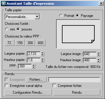 Le fait d'effectuer le rendu directement depuis l'assistant Taille d'impression vous permet d'imprimer l'image actuelle dans un fichier disque au format TIFF. Ce format est généralement utilisé dans l'industrie de l'édition. Pour effectuer le rendu dans un autre format, utilisez le bouton Configuration du rendu de l'assistant.