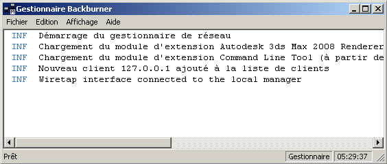 Remarque : Lorsque vous exécutez le programme Gestionnaire, il se peut que vous rencontriez ce message d'avertissement : "Partage de tâche non défini". Cela se produit si ni le dossier de 3ds Max ni le lecteur sur lequel il se trouve ne sont partagés. Normalement, les serveurs copient les fichiers devant être rendus en réseau à partir de la machine source en utilisant les routines standards de copie de fichiers de Windows, ce qui nécessite que le partage soit activé. Si le partage n'est pas activé, le gestionnaire envoie cet avertissement et les serveurs utilisent le protocole TCP/IP pour copier les fichiers. Pour éviter ce message d'avertissement, vous pouvez mettre en place le partage mais cela n'est pas vraiment nécessaire.