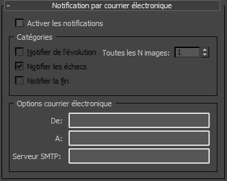 A partir de ce panneau déroulant, vous pouvez configurer un travail de rendu afin qu'il émette des notifications par courrier électronique, comme le rendu réseau. Ces notifications sont particulièrement utiles lors de rendus laborieux et longs, comme un rendu d'animation, car il n'est alors plus nécessaire de demeurer à proximité du système durant l'opération.