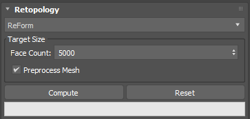 - Preprocess Mesh: Remeshes your model as a pre-processing step before computing the retopology operation. Tip: you can also utilize the ReForm Pre-Process model to generate a proxy remesh object that will be utilized as the data set for the Retopology algorithms to work with.