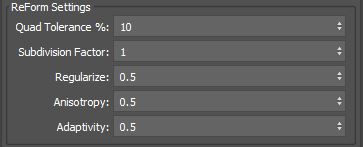 - Subdivision Factor: Specifies whether ReForm will utilize subdivisions to help generate the target output mesh. When this value is set to 1, no subdivision occurs. When this value is set to 2, ReForm will process a quarter of the target quad face count and then subdivide the surfaces to generate a result. When this value is set to 3, a ninth of the target quad face will be generated, which will then be subdivided at two levels to give the target output result.