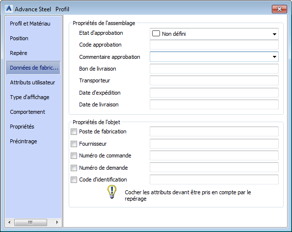 Les données de fabrication des objets sont toujours disponibles et sont définies sur chaque objet, même si certains objets ont le même repère.