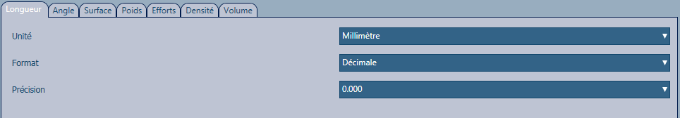 la catégorie Sélection unité. Cette catégorie inclut les unités utilisées lors de la personnalisation de vos boulons, ancrages ou goujons dans Management Tools :