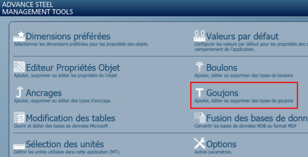 Pour accéder aux paramètres de personnalisation des goujons dans Advance Steel :